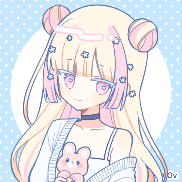 hair: long; pink and blonde. blunt bangs with a hime-cut style framing her face.